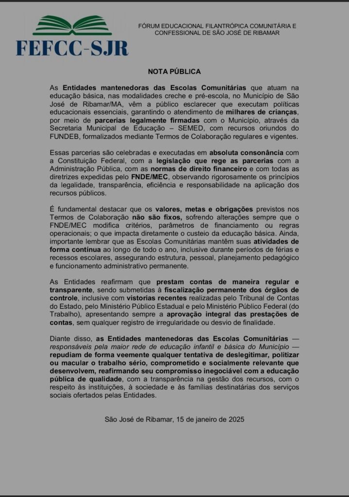 As entidades mantenedoras das escolas comunitárias que atuam na educação básica, nas modalidades creche e pré-escola no município, emitiram na última semana um comunicado público para esclarecer a natureza e a legalidade de suas operações. O posicionamento visa reafirmar o caráter essencial do trabalho realizado, que garante o atendimento de milhares de crianças ribamarenses.